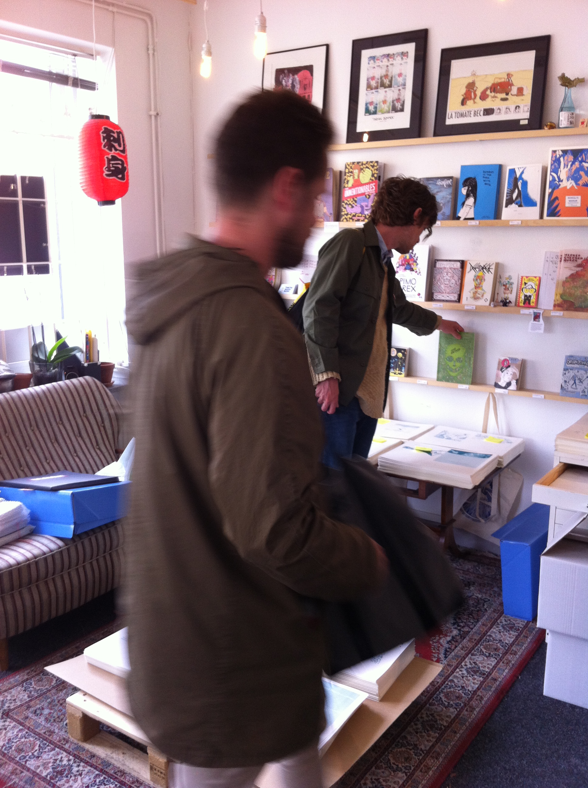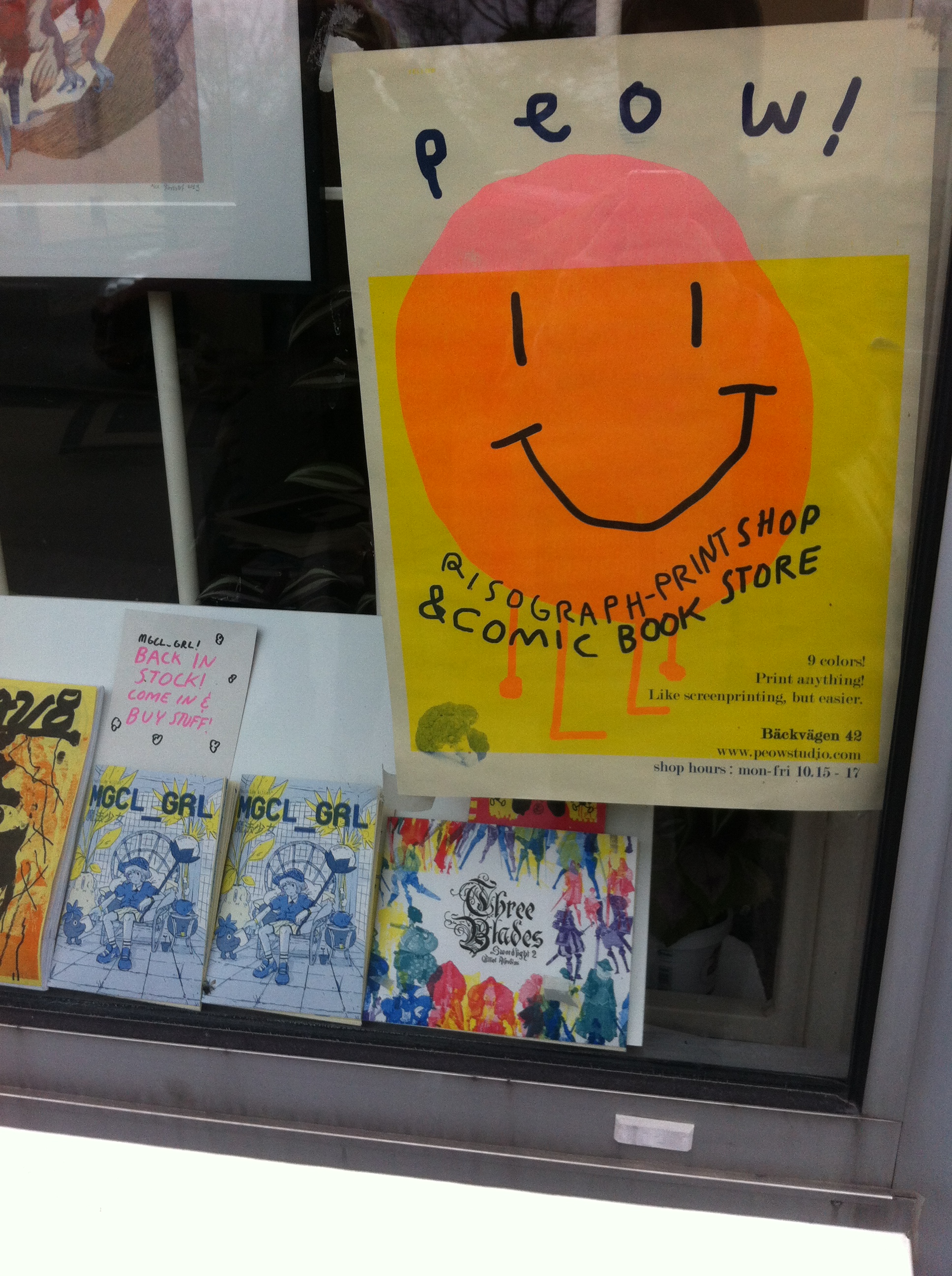 Härom veckan träffades kärnan i Bläck charm för nostalgi vassa tänder hemma hos Elias och Amanda för att deklarera. I huset bredvid, på Bäckvägen 42 i Midsommarkransen, finns risograf-tryckeriet PEOW! Studio. Vi passade på att göra ett studiebesök. Ovan syns Mattias och Anders som kollar in PEOWs shop.