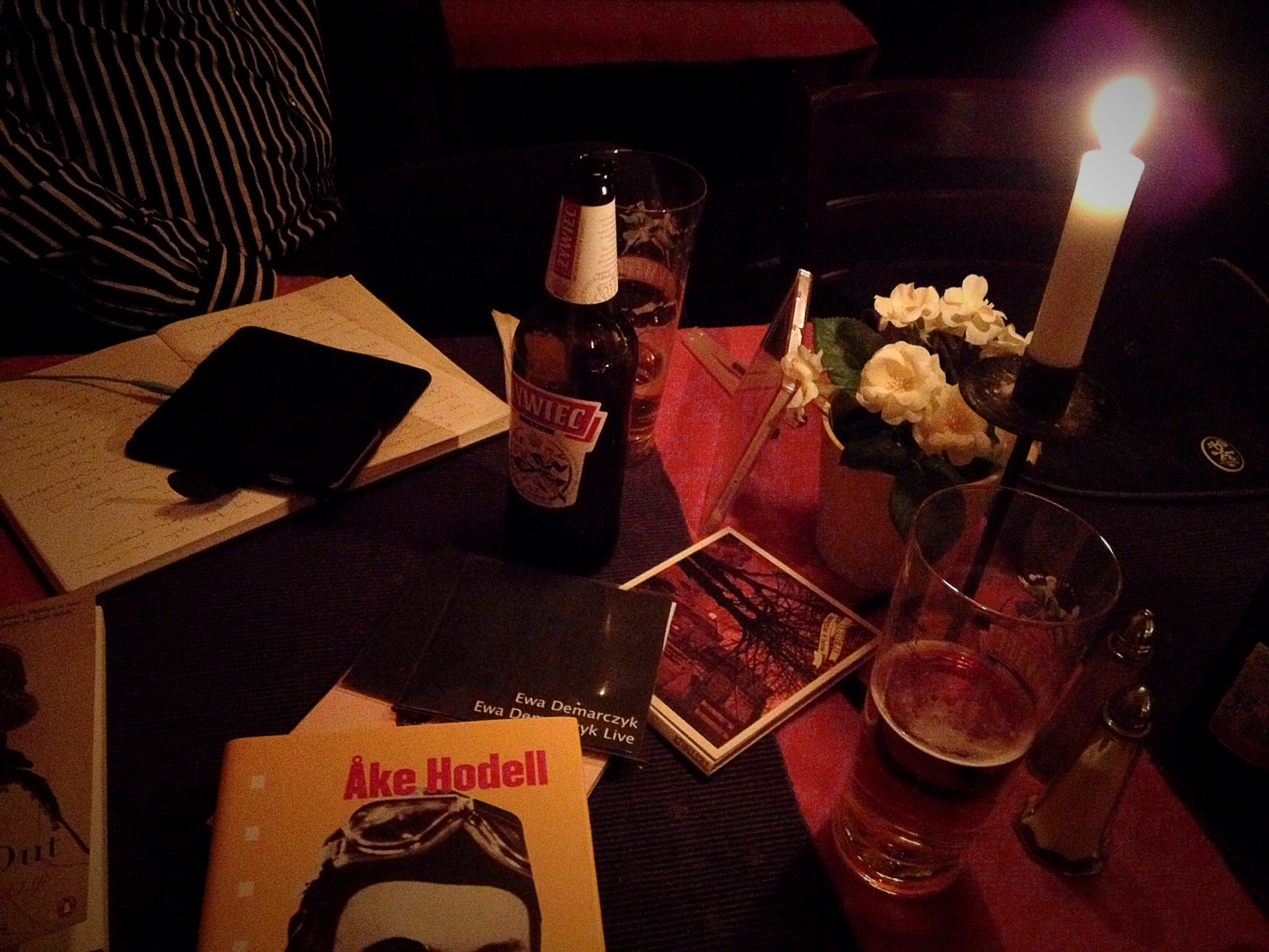 Bokmässan, Göteborg, Hylingers Göteborg. Efter att i flera timmar ha ålat omkring i folkmassan och gjort mitt bästa för att hinna med mer eller mindre intressanta föredrag samt undersökt de smalare förlagens montrar och letat efter fynd bland antikvariaten (hittade bland annat originalupplagan av Morels uppfinning för 30 spänn!) lurar jag med Elias på en öl som sen blir två. Sedan ut i skymningen, leta leta efter restaurang Krakow, tydligen en gammal klassiker i stan, stabbig och billig mat i orenoverade lokaler. Magnus kommer in efter att jag druckit upp halva min första Zywiec, jag ger honom en hög Testbild!skivor och får själv en bok om Åke Hodell och två cd-rskivor med musik av Ewa Demarczyk (från Krakow) som jag minns att han spelade en låt vid namn Violinisten av på ett avsnitt av Lilla Bommen sommaren 1986, han beställer gulasch och jag beställer anka. Vi pratar om sammanhang, Polenresor, öststatsnostalgi och jazz, Bas Jan Ader, konstens villkor och identitetens upplösning. Virginia Woolf, Sebald, Sudden Sway, essäer, den drömda musiken, det ointressanta i att lägga den sista pusselbiten. Jag får lyssna på några smittsamt popiga outgivna Marble Faunslåtar som blandar sig fint med födelsedagssällskapetskrik och skrålanden bakom oss, deras version av den sovjetiska nationalsången. Fyra timmar senare betalar vi och går ut i natten, det regnar, Magnus pekar åt vilket håll jag ska gå.