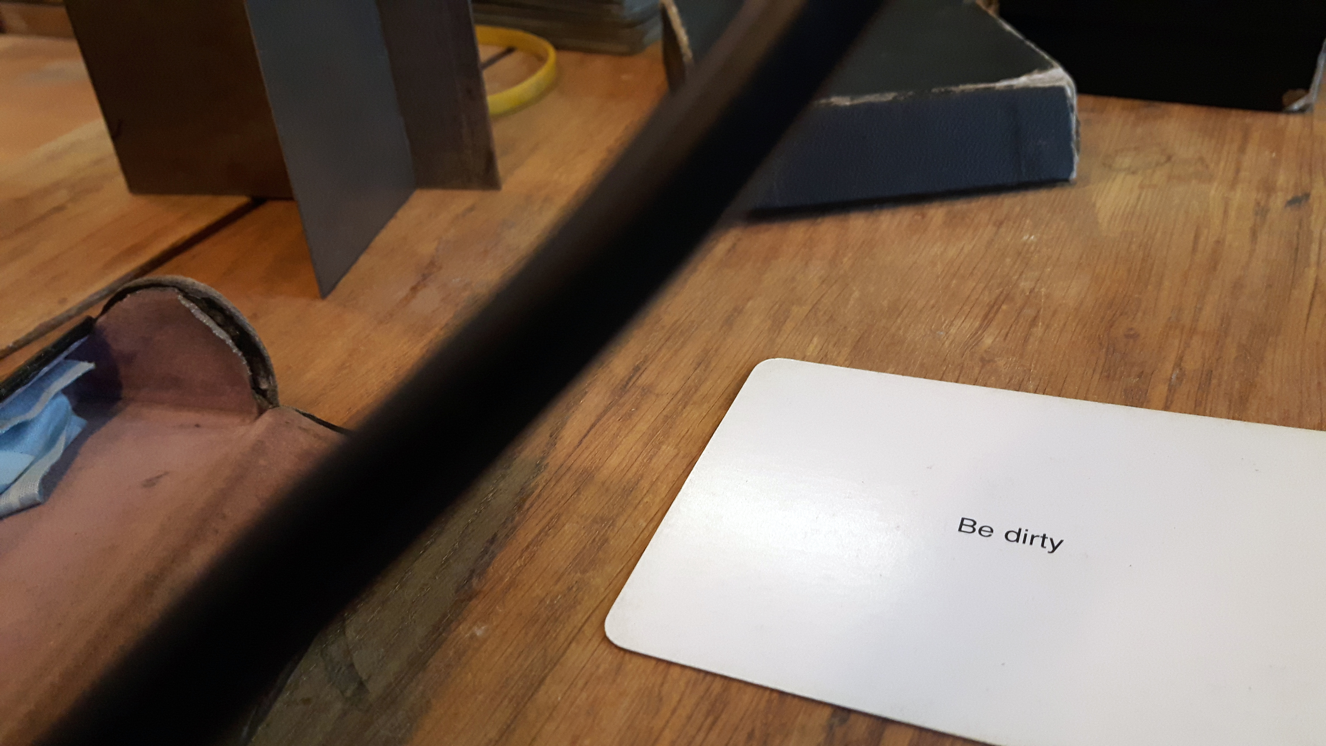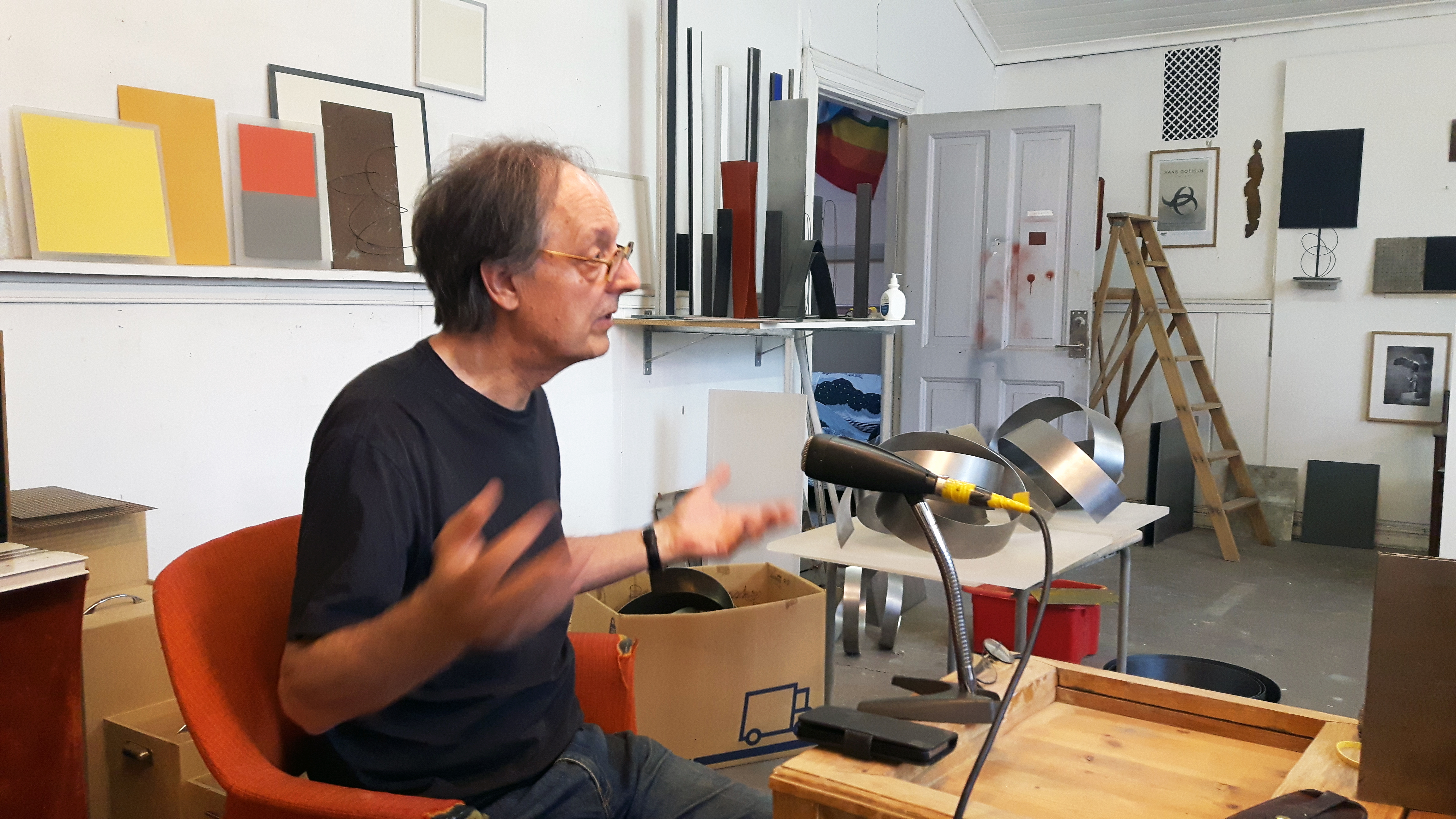 Vi pratar om hur det ena hänger ihop med det andra, om abstraktionens plats i förhållande till materiella förutsättningar. Men framförallt om behovet av koncentration, revision och förnyelse i det egna arbetet, konsten som ett sätt att vara uppmärksam och i rörelse. Och naturligtvis drar vi ett kort i Oblique Strategies. Svaret berättar något viktigt om det vi håller på med. Tid läggs på tid och där utanför, på E4:ans motorväg som löper bredvid Gårdaskolan där ateljén är belägen, fortsätter det bullrande trafikljudet.
