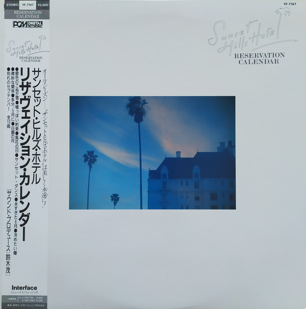 Samlingsserien Sunset Hills Hotel passar perfekt in i denna kontext. Skivorna skulle vad jag förstår ackompanjera och ljudsätta en fotobok utgiven av den japanska filmkrititern Rintaro Hosokoshi. Samlingarna kurerades av låtskrivaren, gitarristen och allkonstnären Shigeru Suzuki. Förutom att ha varit medlem i banden Happy End och Tin Pan Alley tillsammans med bland andra Haruomi Hosono har Shigeru Suzuki medverkat på över 500 inspelningar fram till mitten på 00-talet. Sunset Hills Hotel består av tre omsorgsfullt sammansatta och oantastligt formgivna skivor utgivna 1987, Sunset Hills Hotel, Light Cocktail in Sunset Hills Hotel och den avslutande Reservation Calendar. En rad mer eller mindre namnkunniga japanska artister, bland andra Kazuhiko Kato, Taeko Onuki, Masataka Matsutoya och Asami Kado, står bakom låtarna på skivorna.