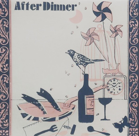 I de sista skälvande månaderna av 70-talet brevväxlade jag med Chris Cutler på Recommended/Ré Records. Eftersom jag har en arkivarie som bor inuti mig så kan jag fortfarande tumma på Ré-pärmen. Det känns som om vardagen åker ut genom fönstret för ett ögonblick, klockan slutar ticka, eller blir i alla fall en sån där Long Now-klocka som tickar så långsamt att det inte hörs. Jag letar, men hittar först ingenting om After Dinner. Jag rotar för långt bak: Ré släppte först 1984 en LP som slogs ihop After Dinners korta och sparsmakade skiva (minus en låt, så att ekorrarna måste ha originalet när de går i ide) från samma år, Glass Tube, med deras långa och inte alls sparsmakade debutsingel. Ré placerade A-sidan (som också heter “After Dinner”, inget konstigt med det) först på sida ett och B-sidan (“Cymbals at Dawn”) först på sida två. Det fungerar alls icke. När bolaget som gav ut Glass Tube återutgav skivan på CD så skickade de med singeln som en tretums-CD istället. Det fungerar. Det är nämligen så att After Dinner skapade en ljudvärld för varje skiva.