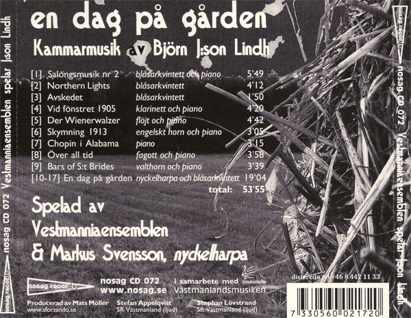Inlägget får mig att fundera en stund över min egen relation till J:son Lindhs musik. Jag har nog lyssnat till en väldigt begränsad del av hans katalog och twitterinlägget som for förbi blir en uppmuntran till vidare förkovring. Mest bekant är jag med delar av 70-talsutgivningen, så nu öppnar jag Spotify och scrollar mig fram till de senare albumen. Valet faller på En dag på gården, J:son Lindhs 20 år gamla kompositioner för kammarmusikensemblen Vestmanniaensemblen och nyckelharpisten Markus Svensson.