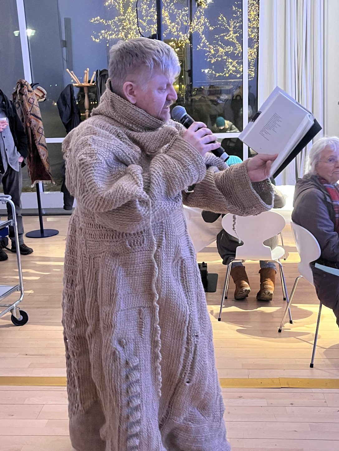 Text: Joakim Granlund Leif Holmstrand är i Växjö för att på Kulturnatten framföra dikter ur sin rika produktion. Årets tema är hjältar. Leif har suttit uppe till 7.30 för att virka klart sin fantastiska skapelse gjord av jutesnöre. Dräkten är oerhört mäktig och kräver en hel resväska för att få plats. Xavier har kört Leif… Continue reading Det fria ordets hus, Växjö 230128