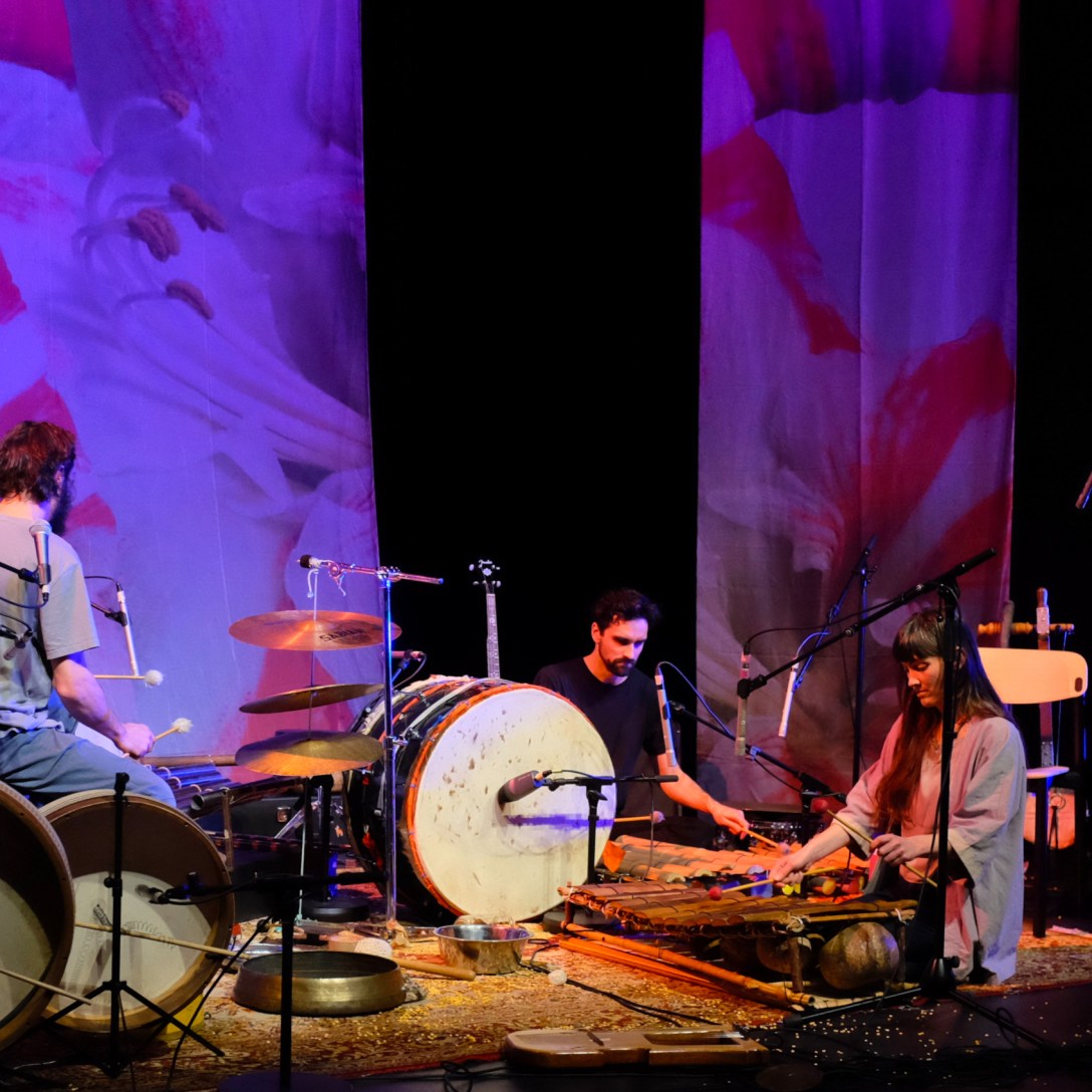 Text: Anton Halldin Tre musikanter växlar instrument löpande genom långa hypnotiska landskap. Musikinstrumenten ligger strödda över golvet, musikanterna sitter ner på golvet i skräddarställning, eller på en låg stol. Taktavdelningen, trummisen, döljs nästan bakom trumskinnen. Fartfyllt: ärtor kastas ner i stålbytta, ett mjukt plaströr vevas runt framför en mikrofon, ett högt sus bildas, ett gammalt… Continue reading Širom, Kulturhuset Bergsjön, 29 januari 2023